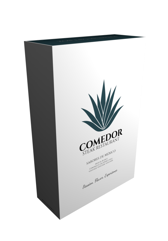 Dárková krabice Comedor - obsahuje 3 ks dárkových poukazů v hodnotě 5.500,-, láhev prémiového Mezcalu Contraluz Cristalino, dvě plechovky s kořením (možnost výběru - vločky papričky jalapeños, španělská uzená pálivá paprika, 100% vanilkový prášek). POUZE OSOBNÍ VYZVEDNUTÍ. - Video s podrobným vyobrazením krabice najdete na našem Instagramu a Facebooku.